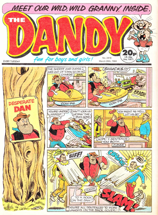 The Dandy was a British children’s comic magazine published by the Dundee based publisher DC Thomson, as was The Beano. The first issue was printed in December 1937, making it the world’s third-longest running comic, after Il Giornalino (cover dated 1 October 1924) and Detective Comics (cover dated March 1937). One of the best selling comics in the UK, along with The Beano, The Dandy reached sales of two million a week in the 1950s. The final printed edition was issued on