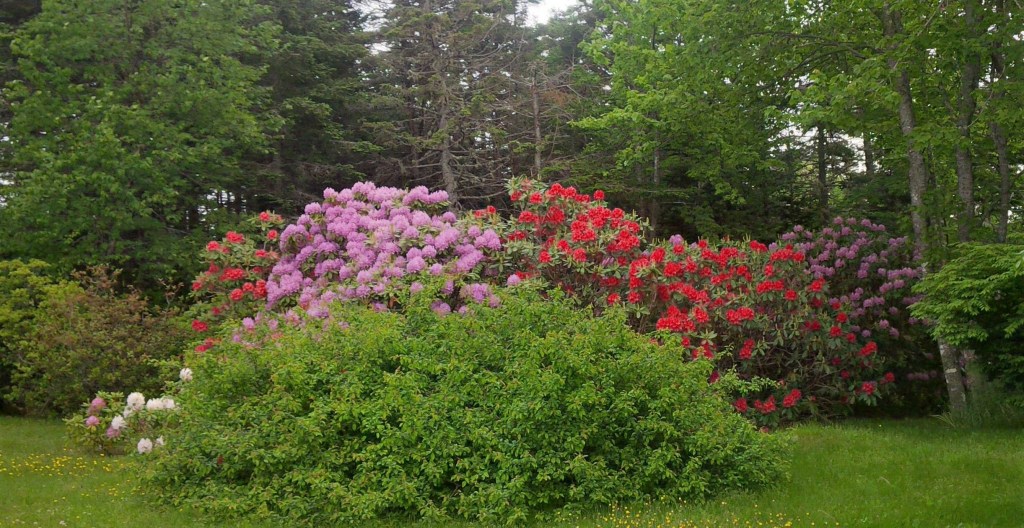 Next, looking straight ahead, I see the trees separating us from our neighbour to the north. And I can hear the tchk, tchk of the black-capped Chichadees, giving me a good telling off for preventing them from coming to the feeders. So, I turn right and see some azaleas and our rhododendrons. Oh, they are not in bloom yet, but I have looked at the buds and know it will be a brilliant display – like these pictures of azaleas and rhodies from last year.