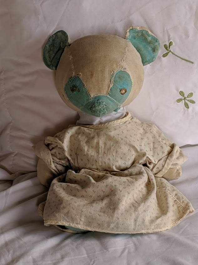 Many years ago, before WWII, as I was trying hard to recover from a serious bout of pneumonia, my Nanny taught me to knit. And, of course, the first of several items I knitted was a pair of shorts and a pullover for my Ted. They were around for many a year, but I believe the moths loved them so much while he and I were separated for several years, that when I last saw them, they were nothing but strings of wool around my Teddy. He doesn’t seem to mind not having them, however.