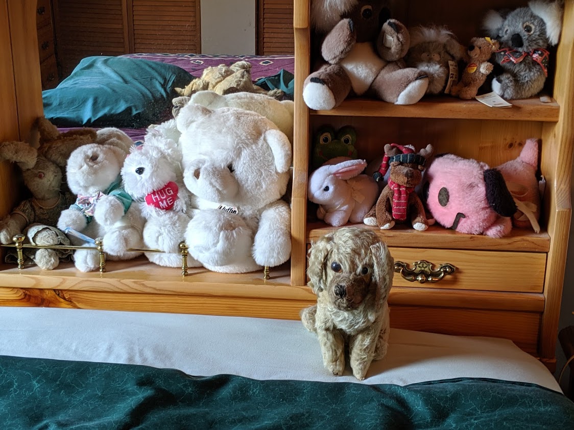 Now, we have many more stuffed friends. In the chair beside our bed, and on the left hand side of the photo above you can see a little piece of Bonzo, my dog. And here is Bonzo, along with a multitude of other stuffed friends. Oh, yes, Bonzo has always been with me, too, but has withstood the passage of time somewhat better than Ted, perhaps because he was a guard dog, sitting there protecting me, whereas Ted was a comforting cuddly friend.